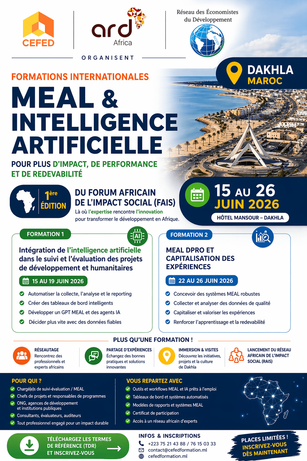 Nous formons les professionnels aux expertises en Suivi, Évaluation, Redevabilité et Apprentissage (SERA), à l’intégration du genre, à l’Intelligence Artificielle (IA) appliquée au développement, ainsi qu’à la Responsabilité Sociétale des Entreprises (RSE).